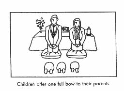 contre terre, devant leurs parents (eux-mêmes assis sur leurs talons,