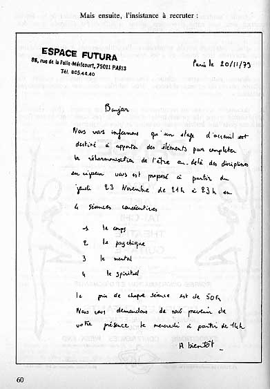 « On nous demanda de venir à un centre de MT, 4, square Lesage, Paris 12`, avec l'argent, un mouchoir neuf strictement blanc (...) des fleurs et des fruits. »