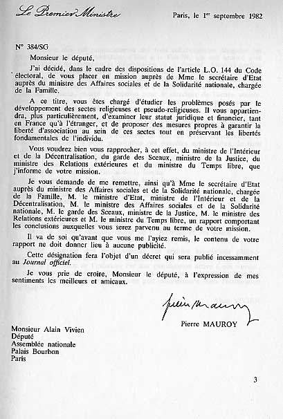 « Le 5 juin 1981, j'ai attiré votre attention sur la mauvaise réputation de votre organisation en France : la Nichiren Shoshu Française, regrettant que parmi les sectes reconnues comme dangereuses, une seule soit d'expression bouddhique, la vôtre.